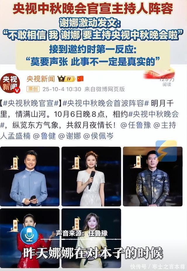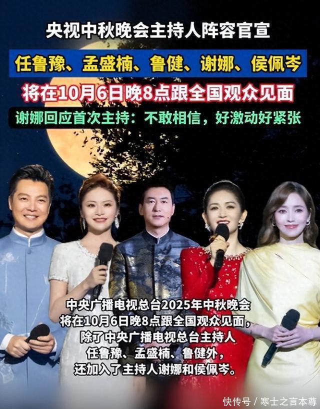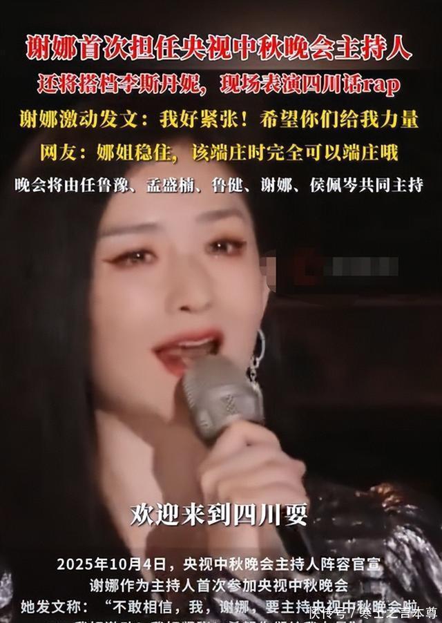 不过看着彩排的画面好像她的状态也挺好的,作为观众,不妨看看结果,也许人家真的可以给大家带来好的惊喜。 不知道您对此有什么看法呢?欢迎在下方评论区留下你的想法,喜欢文章记得点赞关注我们下期再见。 [免责声明]文章的时间、过程、图片均来自于网络,文章旨在传播正能量,均无低俗等不良引导,请观众勿对号入座,并上升到人身攻击等方面。观众理性看待本事件,切勿留下主观臆断的恶意评论,互联网不是法外之地。本文如若真实性存在争议、事件版权或图片侵权问题,请及时联系作者,我们将予以删除. 信息来源: 谢娜回应主持央视中秋晚会微博 新湖南谢娜将首次担任央视中秋晚会主持人 青岛早报谢娜回应主持央视中秋晚会明月千里,情满山河。10月6日晚8点,相约#央视中秋晚会#任鲁豫#谢娜#佩岑 封面新闻v·1天前央视中秋晚会发布主持人阵容,谢娜官宣在家乡主持秋晚!激动发文:不敢相信,我,谢娜要主持央视中秋晚会啦!!!#谢娜#央视中秋晚 @CCTV4中国文艺2025年总台秋晚“隐藏亮点”!主持人@任鲁豫#孟盛楠@鲁健@谢娜誊我是真的谢娜@侯佩岑之间的友情羁绊太暖了