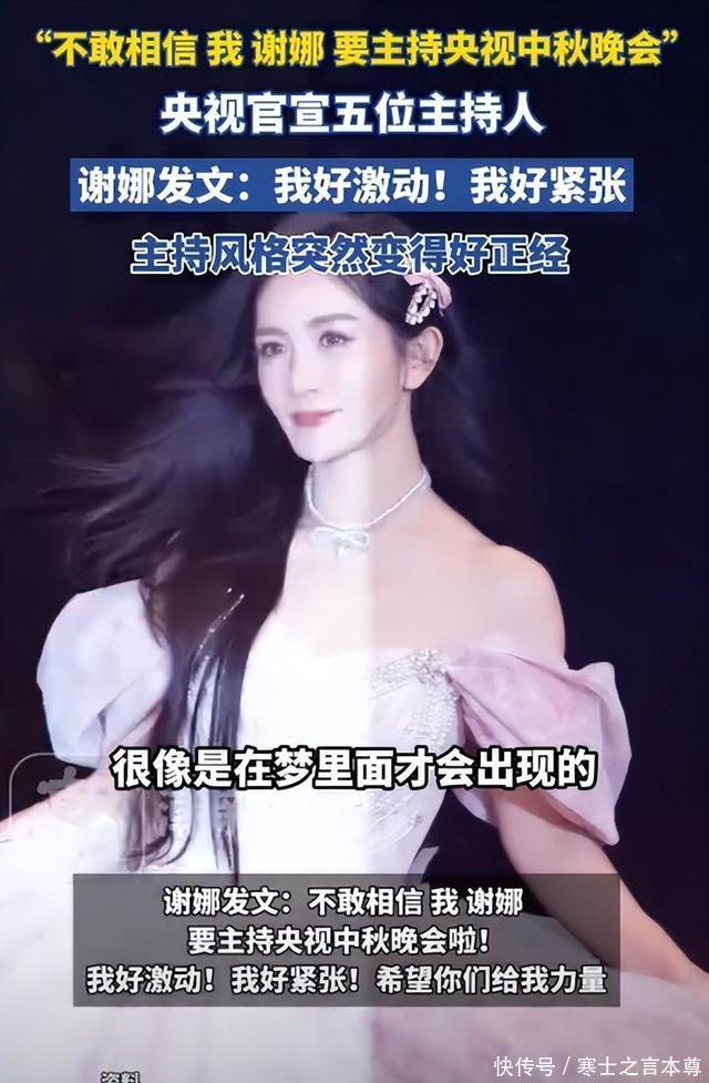 再看看请来的明星,沈腾、周冬雨、周深、韩红,不得不说,这晚会算是把明星的尴尬处境给彻底暴露了...... 起点 10月4号,谢娜自己在网上发了个动态,她要去主持央视的中秋晚会,从她发的文字上都能看出来她很高兴,又有点紧张。 差不多同一时间,央视那边也把主持人名单给亮出来了,任鲁豫、孟盛楠、鲁健这三位老熟人,再配上两个新面孔,一个是谢娜,另一个是侯佩岑。